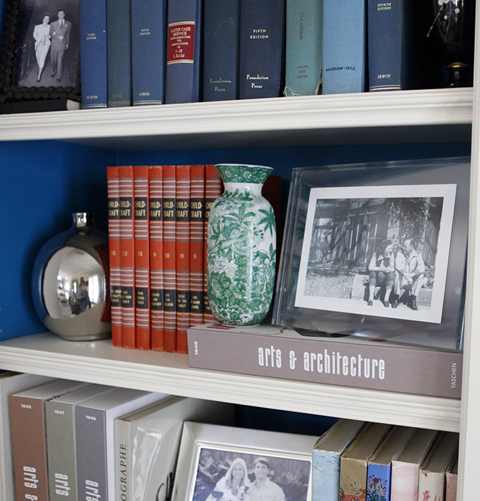 Without a doubt, the items that you use to style your bookcase will change and evolve over time. Mine is constantly in flux...frames and photos change and I'm constantly making room for random items picked up during shopping adventures. Right now this bookcase is filled with books, framed photos, and a couple of vases, one of which was purchased by my great aunt during a trip to Japan.